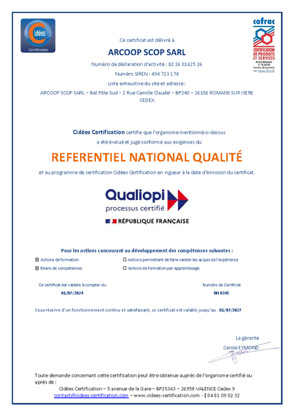 Nous sommes bénéficiaires au travers de notre appartenance au collectif d'entrepreneur ARCOOP de la certification Qualiopi.